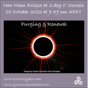 This month’s new moon in the transformative and powerful sign of Scorpio is intensified by being a partial solar eclipse. Eclipses occur when the Luminaries (Sun and Moon) are within 18 degrees of the lunar nodes. This new moon is a south node eclipse.