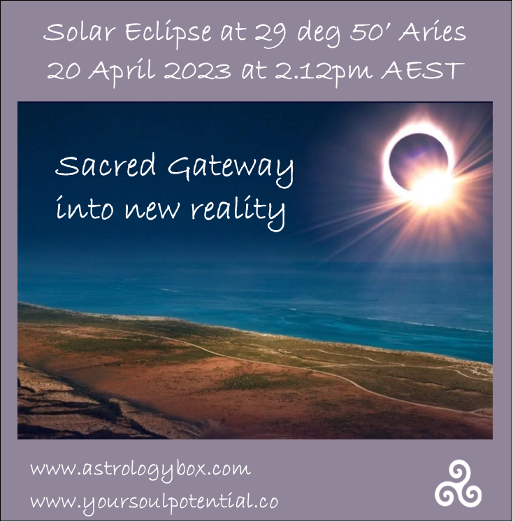 2023’s second new moon in Aries or “blue moon” is a rare type of solar eclipse know as a hybrid, accounting for only 3% of all eclipses. It suggests a powerful shift between states of being, a transition or transformation.