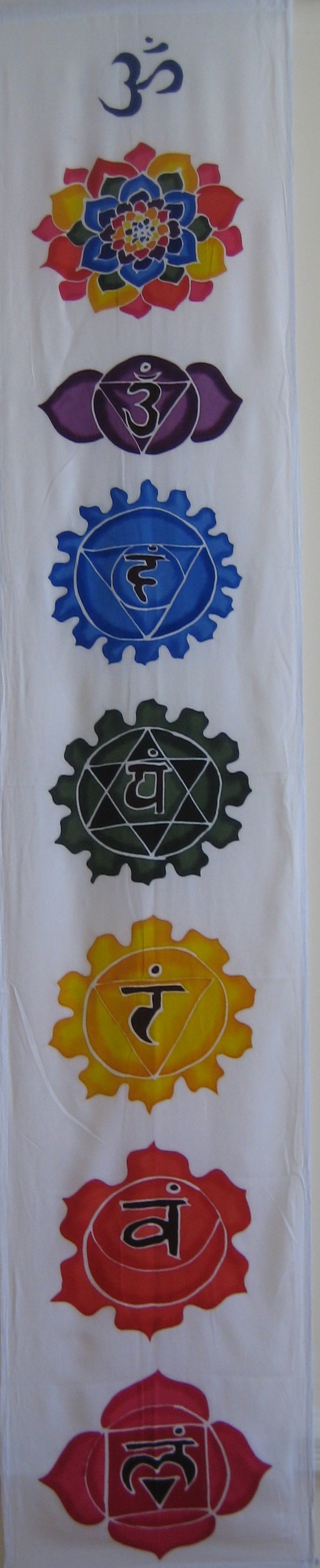 Each chakra banner has been individually hand batiked on durable natural fabric (rayon) and represents an individual piece of art.  The top is hemmed for easy wall hanging with a rod or cord.