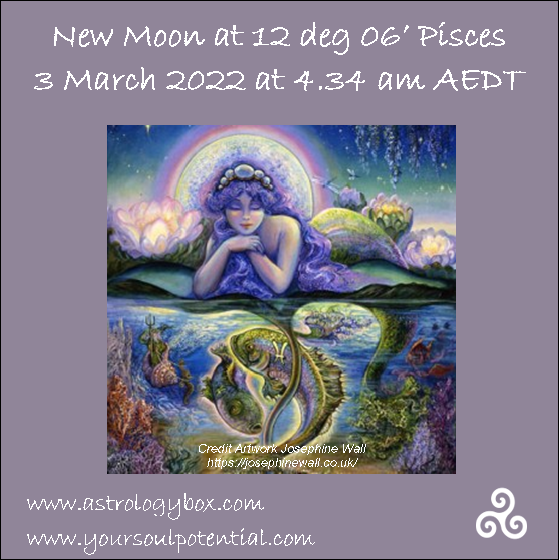At this new moon both the traditional and modern rulers of Pisces, Jupiter and Neptune, are in the sign of Pisces, boosting the Piscean energy and encouraging us to dream big. Our sensitivity and empathy is likely to be heightened, creating avenues for spiritual breakthroughs as well as bringing a sense of overwhelm. Be aware of your boundaries and not taking on other people’s energy or too much distress at the global events. Tune into the higher aspects of unity, peace and oneness and send loving energy to all those suffering.